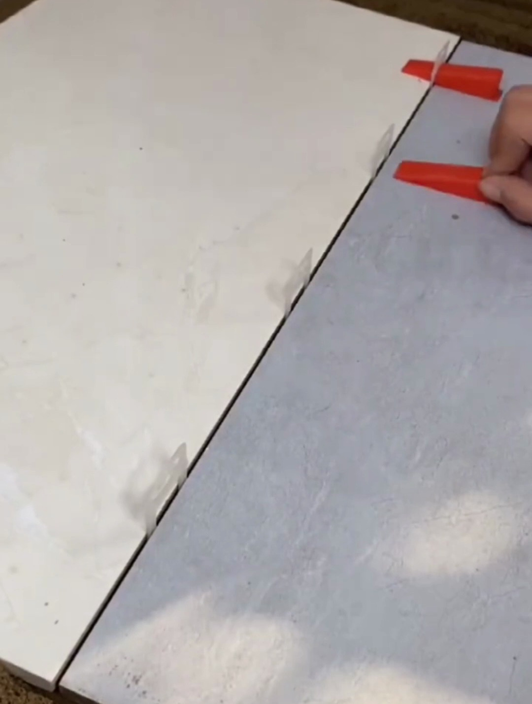16、5小时后1铺贴瓷砖要在在瓷砖与瓷砖间留2mm左右的缝隙2将瓷砖找平器插进缝隙中把瓷砖压实3将瓷砖找平器旋转90度,让其卡住底部,用扳手调整找平器调节盖保持水平等到五个小时后,取出找平器。
